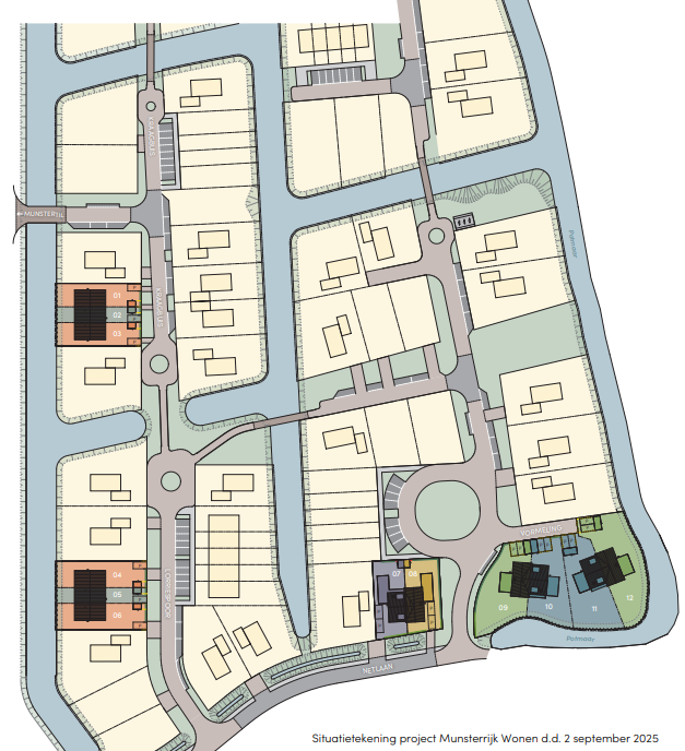 Nieuwbouwplan Munsterrijk Wonen is onderdeel van de nieuwste wijk van Winsum: Munster. In deze duurzame, groene én gasloze wijk woon je veelal direct aan het water in een huis dat klaar is voor de toekomst. Het plan bestaat uit 12 woningen: 6 drie-onder-een-kapwoningen en 6 levensloopbestendige half vrijstaande woningen. De 6 drie-onder-een-kapwoningen liggen met de tuinen direct aan het water en zijn allen voorzien van parkeergelegenheid op eigen terrein. De half vrijstaande woningen met de bouwnummers 07 en 08 zijn gelegen aan de Netlaan. Er is bij beide woningen voldoende ruimte voor het parkeren van maar liefst twee auto's op eigen terrein. Behalve vanaf de voorzijde zijn de tuinen ook bereikbaar middels een poort aan de achterzijde. De half vrijstaande woningen met bouwnummer 09 t/m 12 zijn een ware blikvanger! Ze liggen met de op zuid georiënteerde tuinen direct aan het water. De zeer royale percelen met tuinen rondom zorgen voor een heerlijk gevoel van vrijheid.